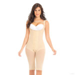 Faja larga con espalda y sisa cubierta, incluye hombro ajustable y tira estabilizadora removible en la zona del busto que permite mantener la manga de la faja en su lugar, cuenta con 4 niveles de abrochadura que ofrece un ajuste a la medida, tanga adaptable que facilita el uso del baño.
